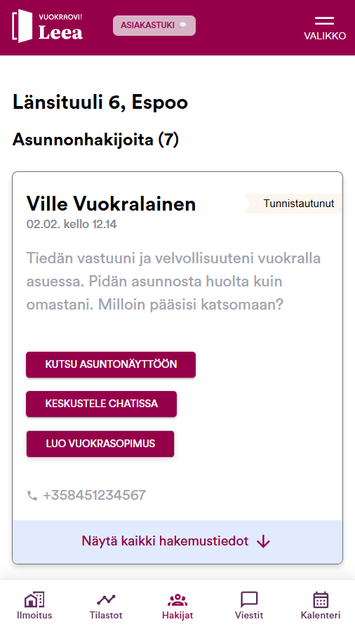 Asunnonhakijat täyttävät vuokrailmoituksen yhteydessä olevan sähköisen hakemuslomakkeen. Saat kaikki asuntohakemukset yhteen näkymään vertailukelpoisessa muodossa, jotta voit tutustua ehdokkaisiin rauhassa.